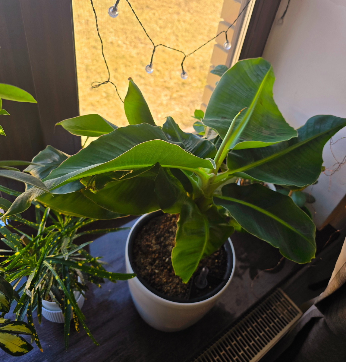 Да, он любит свет и воду (пьет как настоящий водохлеб!), но прощает множество ошибок. Мои бананы прекрасно растут как на обычном окне без досветки, так и под лампами, при разной влажности. Единственный нюанс: на окне над батареей немного подсыхают кончики листьев.