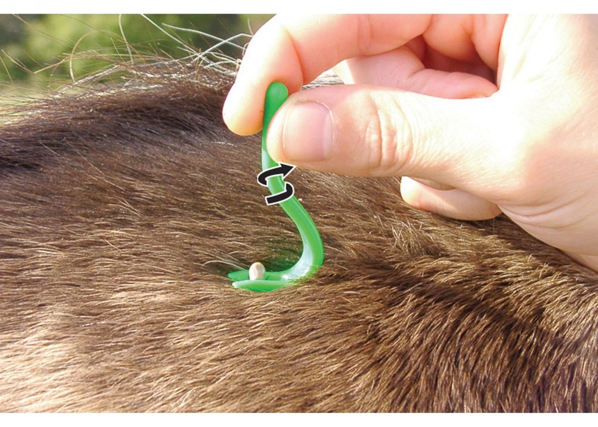- С помощью выкручивателя: Подцепите клеща в прорезь крючка как можно ближе к коже собаки (под брюшко паразита). Слегка приподнимите крючок и сделайте 2–3 оборота в любую сторону (как будто откручиваете винт). Клещ выйдет целиком вместе с головой без усилий.