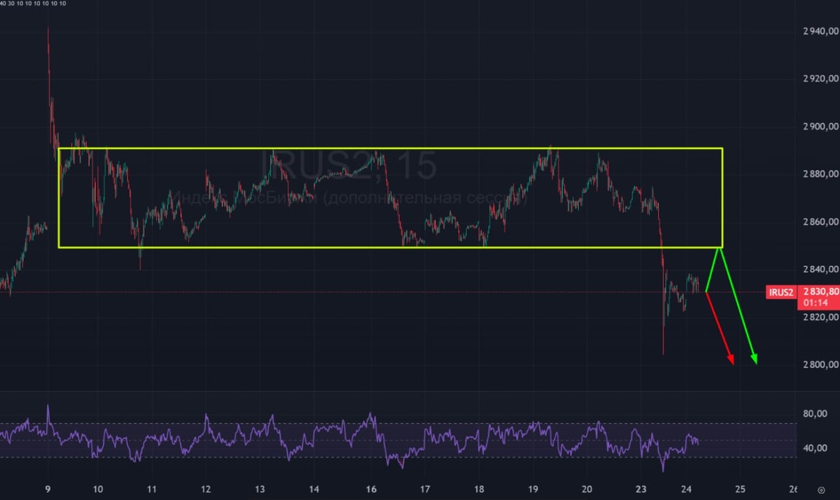 🟢 Утренний рост по индексу мосбиржи съеден. Рост с утра был только за счет роста цены на нефть, но нефть существенно снизила свою динамику роста. В целом, жду индекс на снижение - в район 2800. К 2800 можем пойти как по прямой, так и через тест желтого боковика. 🚗 Ожидаю снижение индекса. Позже, от 2800, с большой вероятностью, буду ожидать движение вверх. #индекс #индексмосбиржи #ммвб #irus #mxi #mix #imoexf #bogdanoffinvest $MMM6 $MMU6 $MXM6 $MXU6 $IMOEXF