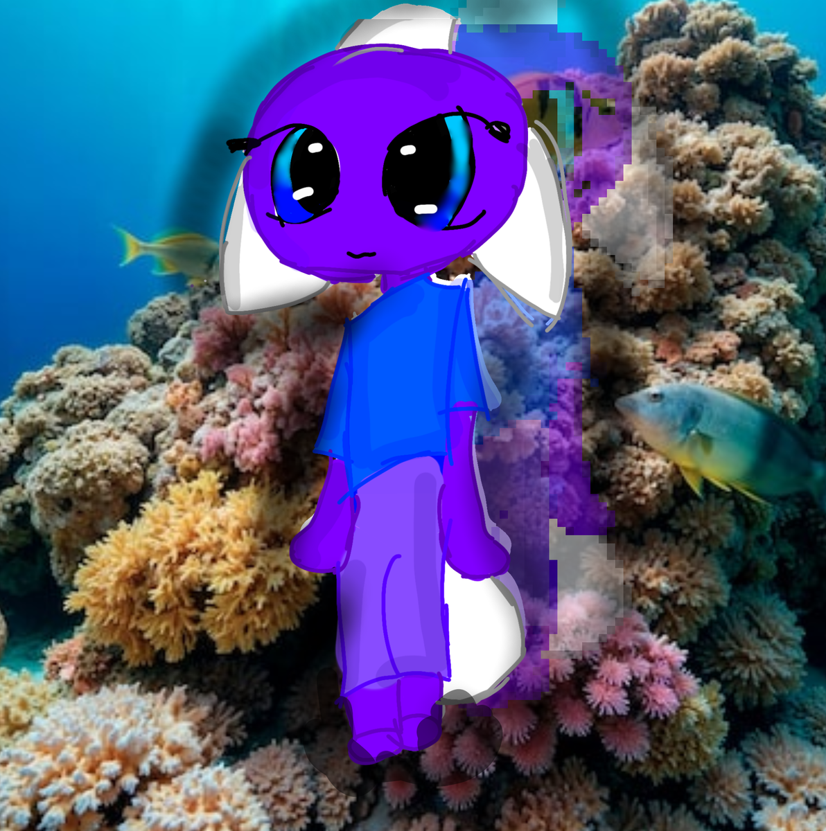 Внешка: фиолетовая рыбка с синей футболкой и с фиолетовыми штанами