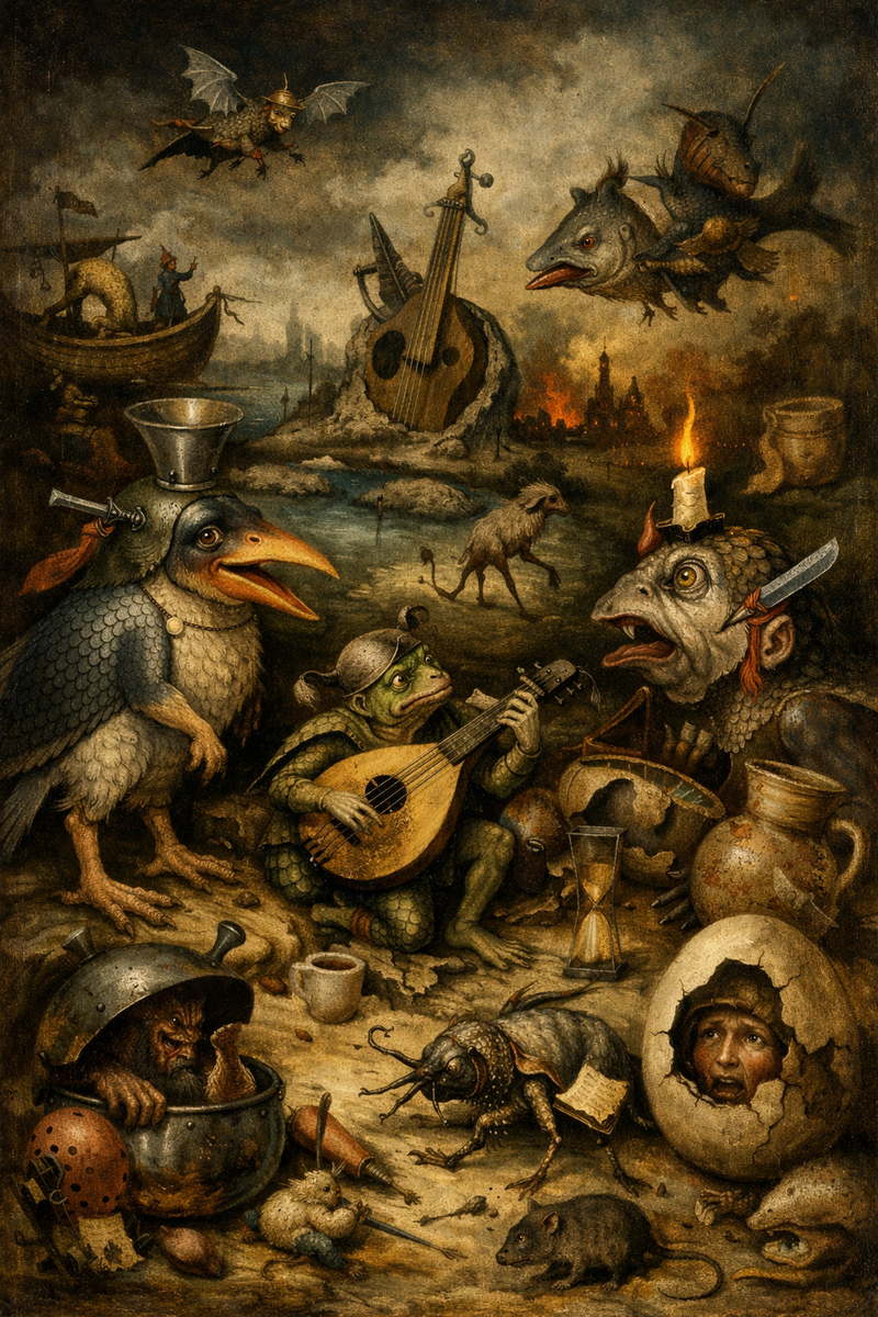 Нож, пронзающий ухо. Музыкальный инструмент, который вдруг перестаёт быть мирной вещью и начинает выглядеть как часть кошмара. В этом и сила образов Босха: он не выдумывает чудовищ с нуля, а словно собирает их из кусочков реальности. Он берёт то, что человеку хорошо знакомо, и нарушает привычный порядок. Животные теряют свою естественность, предметы – своё назначение, тело – цельность. Всё начинает смешиваться, сдвигаться, жить по тревожной, искривлённой логике. Наверное, поэтому его живопись д