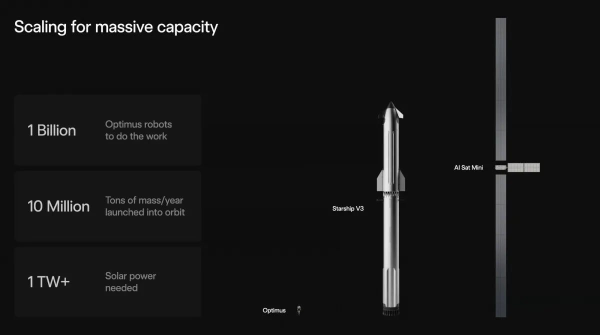 … Тут на днях Илон Иванович (Маск, понятное дело) в полный рост презентовал свою новую идею по освоению космоса. До этого он только рассказывал о том, что хочет запустить в космос «портативные центры вычислений для ИИ», теперь же представил и картинку. Если масштабы на иллюстрации верны, то AI Sat Mini, а именно так называется новый спутник, будет размером не менее 170 метров. Ну, точнее, таким будет максимальный размах солнечных панелей и это нам говорит о том, что при транспортировке к месту выгрузки они будут находиться в сложенном состоянии. Как и у Starlink, но с более сложной механикой раскрытия и позиционирования. Установленная мощность солнечных панелей будет составлять более 100кВт, а радиатор, который ДОЛЖЕН отводить тепло, будет размером в 100 квадратных метров. Ну, посмотрим, получится ли у него… Кстати, заявку в FCC (Федеральную комиссию по связи) на развёртывание спутников он подал уже в январе этого года и планирует развернуть созвездие из более, чем миллиона таких да
