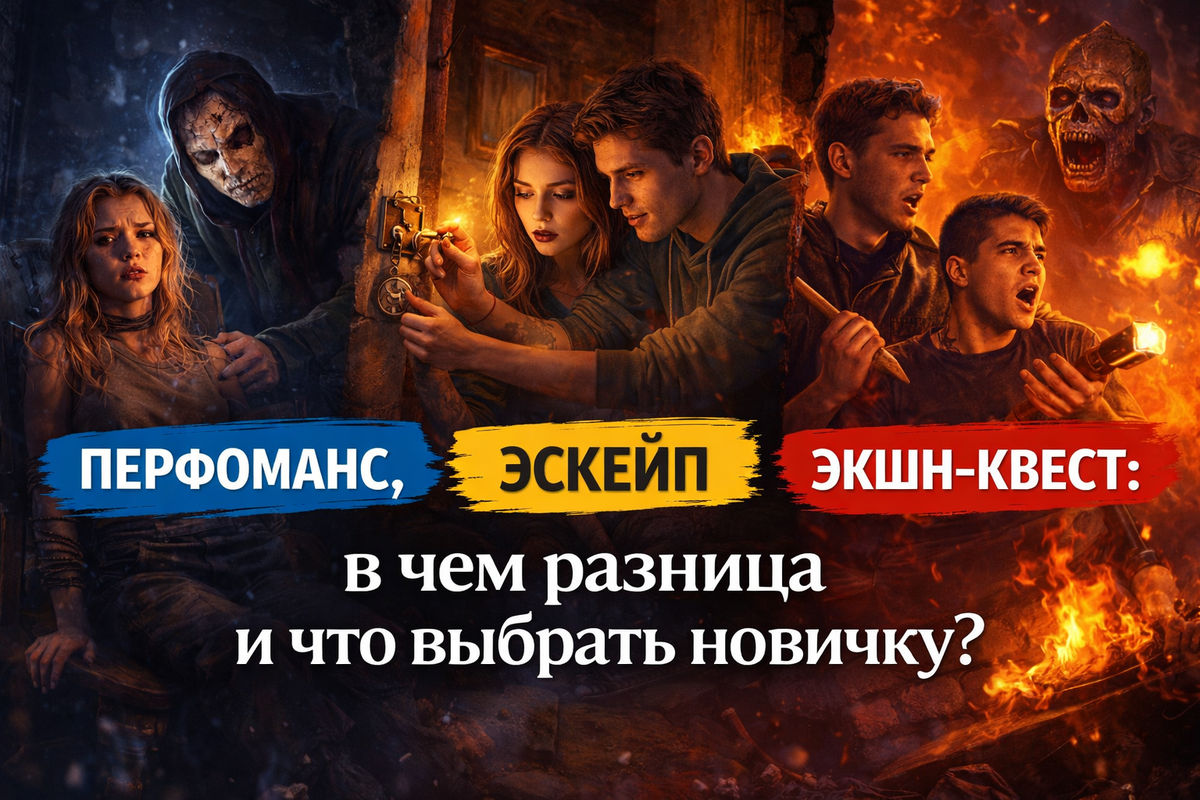 Первый квест — как первое свидание: если что-то пошло не так, то продолжения не будет. Давайте разберемся, как выбрать идеальный вариант! Для этого необходимо определиться с форматом, который вам интересен. В этой статье мы рассмотрим три наиболее популярных разновидности квестов, чтобы вы понимали разницу. Перформанс Всегда смеялись над тем, как герои фильмов ужасов совершают максимально нелепые действия, убегая от маньяков? А вы уверены, что сами справились бы лучше в стрессовой ситуации? Что ж, тогда проверьте свои силы в перформансе. Это квест с участием актеров, где загадок почти нет, а вот беготни и пряток от маньяков или мистических существ — предостаточно. Посмотрим, кто будет смеяться последним! Квест (эскейп-рум) Если же хочется именно пораскинуть мозгами, но от слова логарифмы бросает в дрожь, то вам подойдет классический квест (он же эскейп-рум). Здесь акцент сделан на загадках, а участие актеров не предусмотрено. При этом знать ничего серьезнее, чем таблицу умножения или к