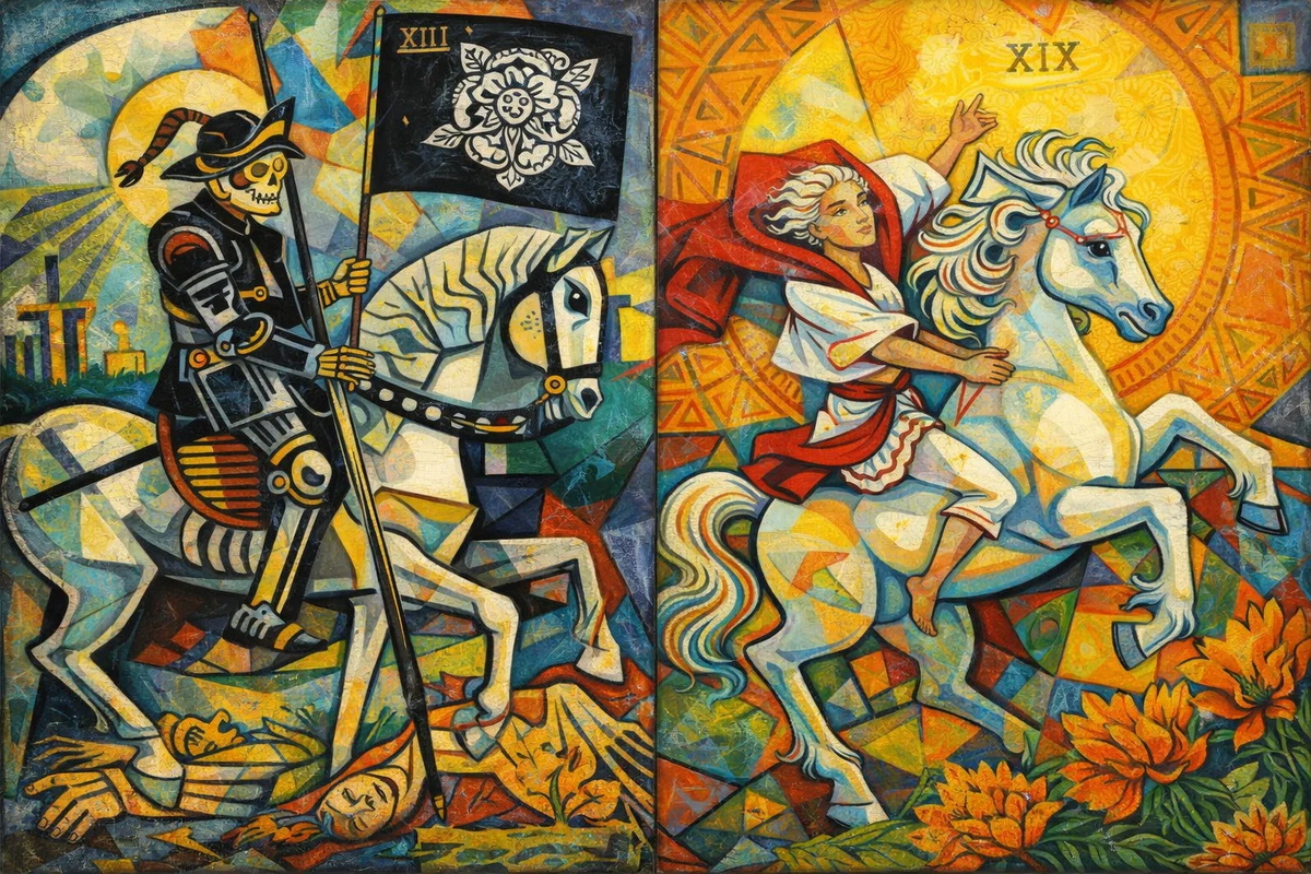 Белая лошадь в Таро — один из тех символов, которые одновременно просты и бездонны. Она появляется в двух, казалось бы, противоположных Арканах — Смерть и Солнце — и именно это совпадение заставляет остановиться и всмотреться глубже. Потому что совпадений в символике не бывает. Есть повторение смысла на разных уровнях, в разных тональностях Если искать исток образа, белая лошадь уходит в древние представления о носителе силы, движения и перехода. Посредник между мирами, кто переносит героя через границы: между жизнью и смертью, между тьмой и светом, между старым и новым состоянием. Белый цвет здесь не украшение. Это цвет очищения, предельности и перехода. Белое — это то, что больше не смешано ни с чем. Форма ставшая максимально чистой, почти прозрачной для смысла. И если соединить эти два элемента, возникает образ: белая лошадь — движение, очищенное до сути движение без искажения