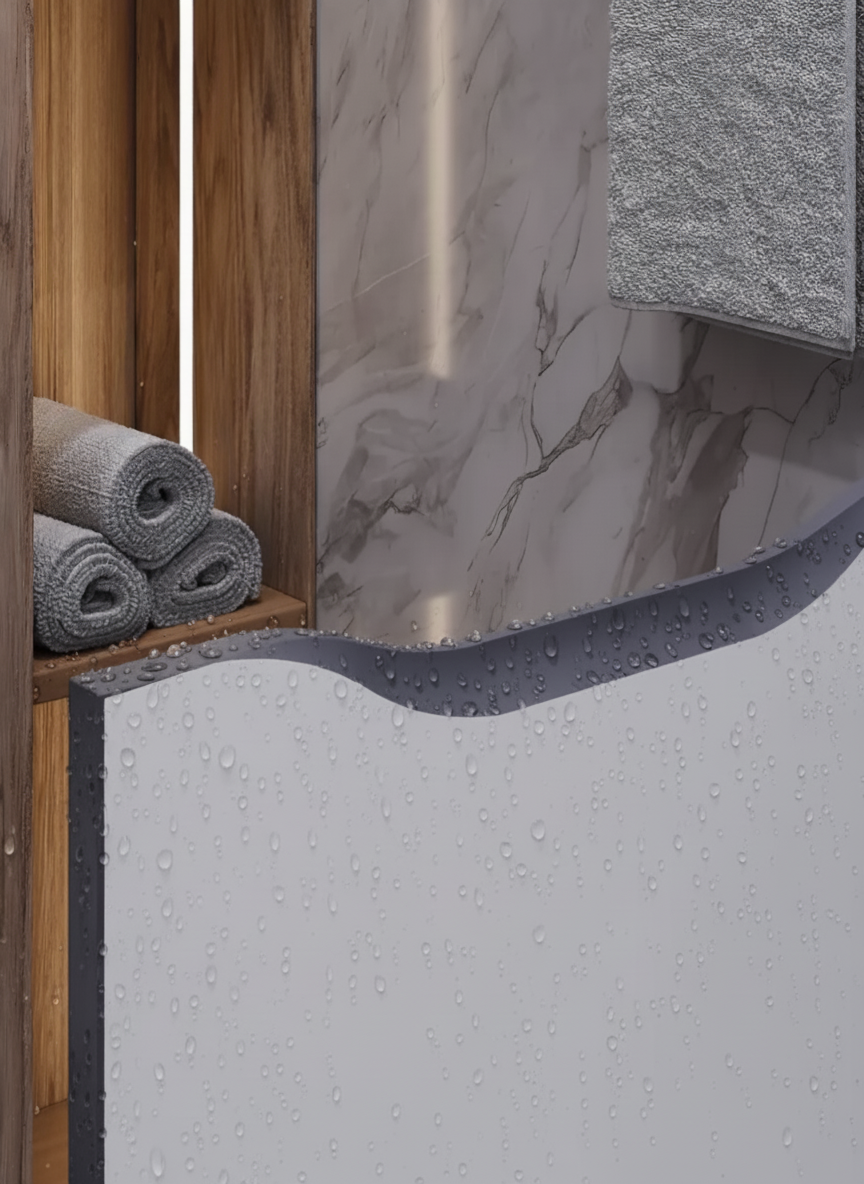 Торцы мебельных деталей — это самые уязвимые места. Представьте, что это открытые поры, через которые влага легко проникает внутрь. Если кромка приклеена на обычный клей (ЭВА), который боится влаги и перепадов температур, то со временем она просто отходит. И вот тут начинается самое интересное: вода получает прямой доступ к незащищенной плите. Как защитить мебель для ванной от влаги? Ищите мебель, где кромка приклеена на влагостойкий ПУР-клей. Это надежный герметик, который создает непроницаемый барьер и не дает влаге ни единого шанса.