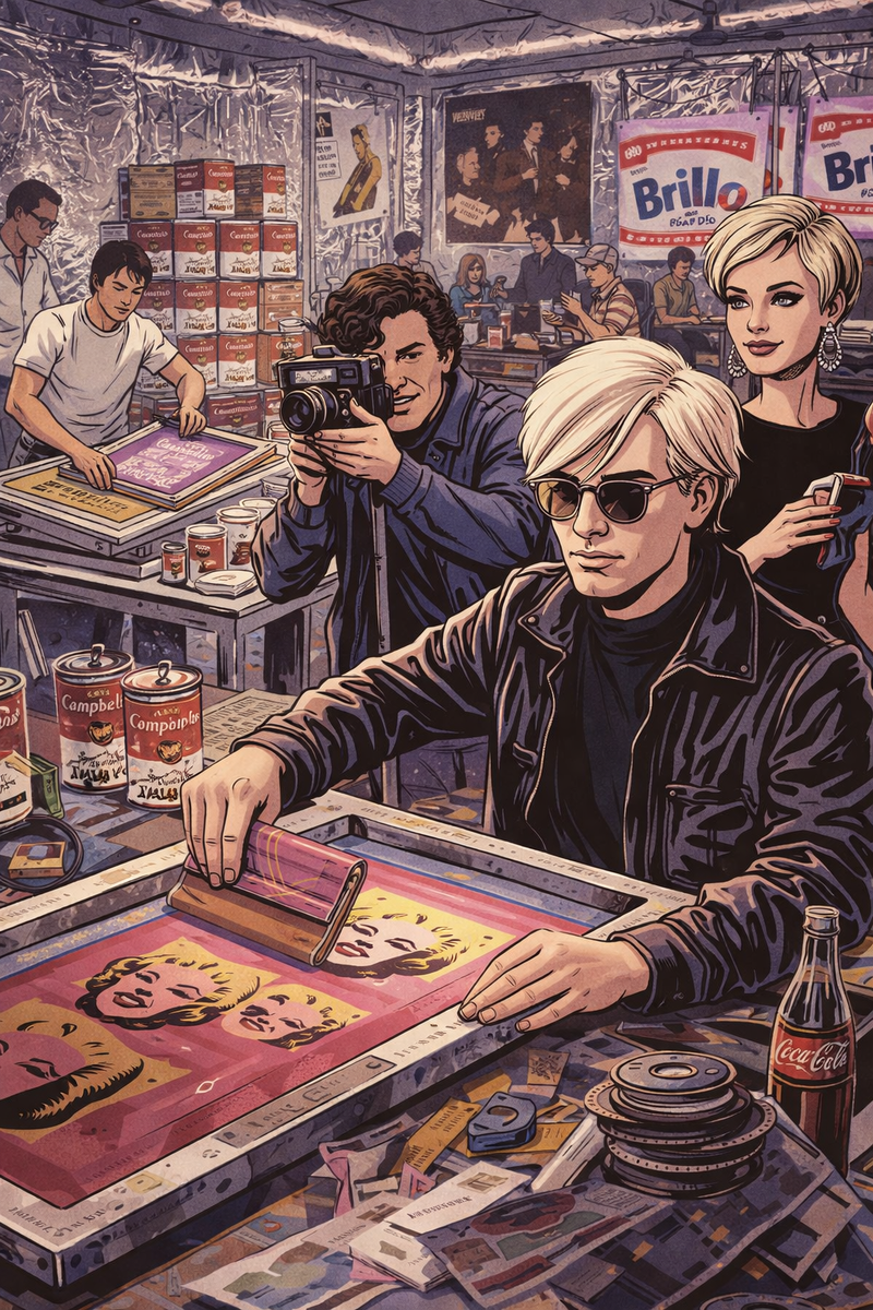 А у Энди Уорхола всё было иначе – шумно, быстро, сериями. И на глазах у публики. “Фабрика”–его студия в Нью-Йорке до сих пор вызывает споры: это гений или конвейер, который просто отлично умел продавать? “Фабрика” была не тусовкой. Это был метод. Студия работала как маленький завод: кто-то печатает, кто-то подбирает цвета, кто-то снимает, кто-то приносит идеи–и в итоге рождается не один шедевр, а серия. И в этом был смысл. Потому что мир 60-х уже стал таким: реклама, упаковки, лица, новости–всё тиражируется, повторяется, становится знаком. Уорхол просто сказал: раз эпоха живёт тиражом–искусство тоже может. Да, часть работ делали ассистенты. Да, шелкография. Да, «рука художника» будто исчезает. Но его авторство было в другом: в выборе. Он брал образ и превращал его в символ. Повторял так, что он переставал быть «картинкой». Мэрилин Монро–не портрет, а икона.