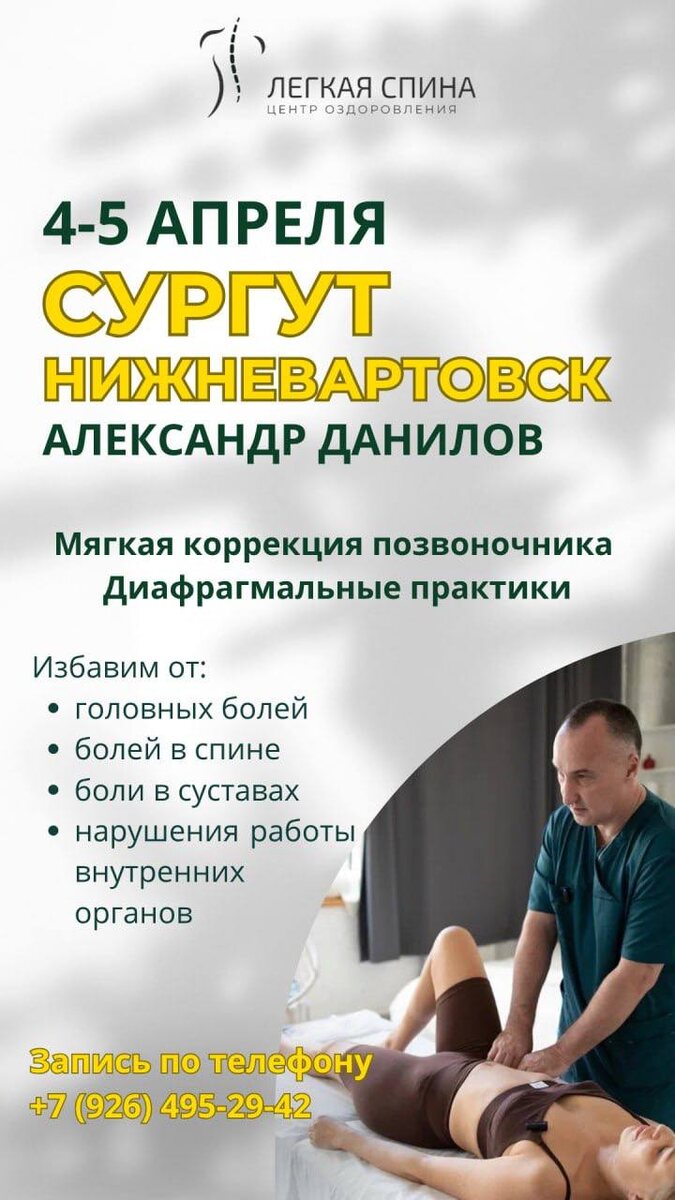 Друзья, мы напоминаем, что специалисты центра Легкая Спина выезжают в регионы, чтобы помочь всем, кто в этом нуждается. Если вашего региона нет в списке, вы можете оставить заявку по телефону + 7 (926) 495-29-42 и наши специалисты приедут в ваш город. На сегодняшний день открыта запись в следующих городах: 📍 Калининград - 28-29 марта 📍 Сургут | Нижневартовск - 4-5 апреля 📍 Челябинск | Екатеринбург - 10-11 апреля 📍Омск - 18-19 апреля 📍 Уфа - апрель, 2026 📍Волгоград - апрель, 2026 📍Красноярск - апрель, 2026 📍Горно-Алтайск - апрель, 2026 📍 Улан-Удэ | Чита | Иркутск - май, 2026 Избавим от: 🔸мигреней и головных болей 🔸болей в шее, спине и пояснице 🔸остеохондроза, сколиоза и грыж 🔸нарушений работы внутренних органов ✍️ Запись по телефону + 7 (926) 495-29-42