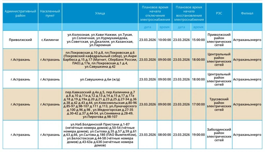 Энергетики предупреждают об ограничении в подаче электроэнергии в первый день недели некоторым абонентам. 23 марта на несколько часов свет отключат по некоторым адресам в областном центре, а также в селе Килинчи Приволжского района. В частности, без электричества останутся как жилые дома, так и церковь, банк, а также супермаркет. Увидеть полный список адресов, попадающих под отключение, можно ниже: А если отключения произошли внепланово, звоните по телефонам, которые указаны ниже: Сообщение 23 марта в Астрахани пройдут плановые отключения электричества появились сначала на Астрахань.Ру последние новости региона.