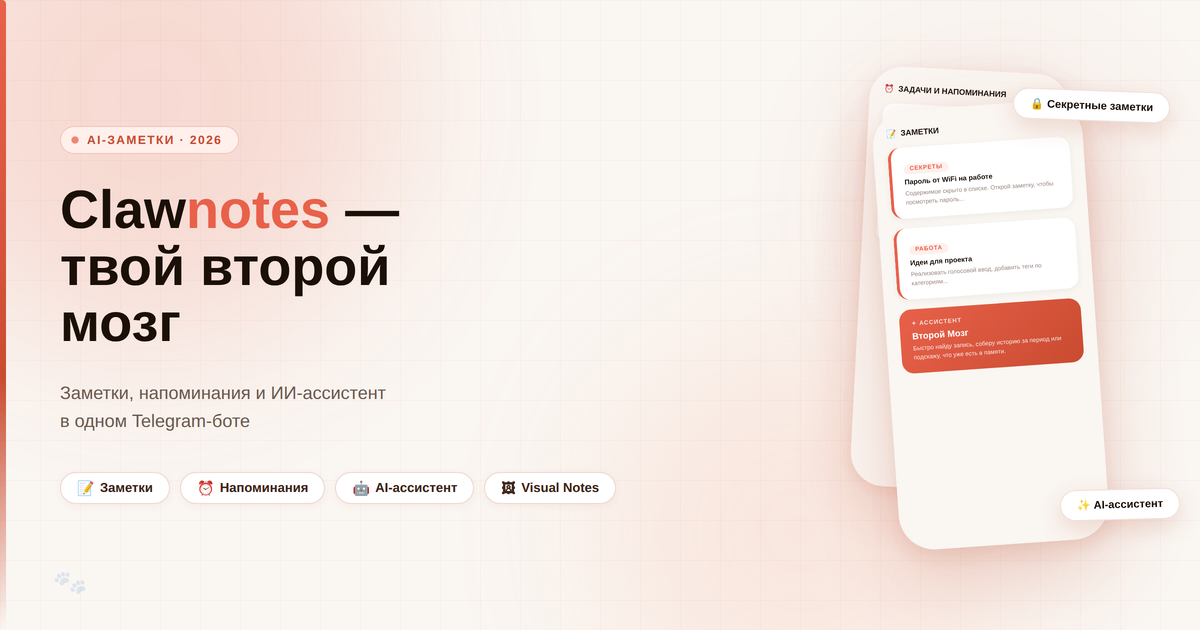 Большая часть важной информации обычно теряется между чатами, заметками, голосовыми и списками задач. Что-то сохранил в Telegram, что-то в заметках телефона, что-то просто держишь в голове. В результате нужное потом сложно быстро найти. Я сделал Clawnotes — Telegram-бота и WebApp, который помогает хранить заметки, задачи, напоминания, голосовые и фото в одном месте, а потом искать по ним по смыслу, теме или дате. Зачем это нужно