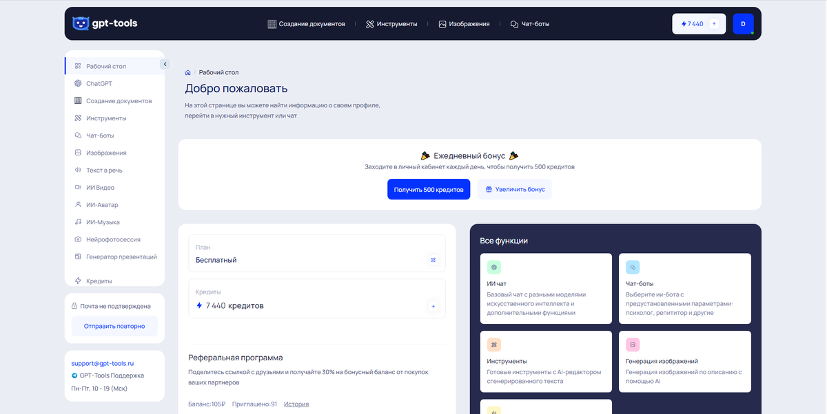 gpt-tools.ru — это онлайн-сервис, предоставляющий доступ к инструментам на базе нейросетей семейства GPT. Платформа работает как агрегатор: пользователь получает доступ сразу к нескольким моделям и функциям в одном интерфейсе.