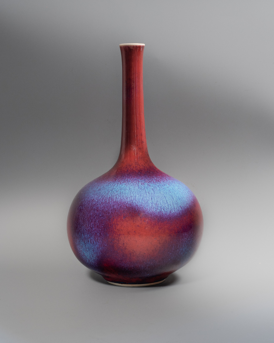 Соблюдён баланс. Но при этом пространство остаётся… нейтральным. Без центра. Без напряжения. Именно здесь появляется ключевое понятие — художественный акцент. Это предмет, который не просто привлекает внимание, а организует пространство вокруг себя. Хороший пример — ваза с глазурью фламбэ, созданная в Японии в период Мэйдзи. Её визуальный эффект строится на сложной технике: глубокий красный фон покрывается спонтанными потёками синего, фиолетового и голубого. Этот рисунок невозможно полностью контролировать.