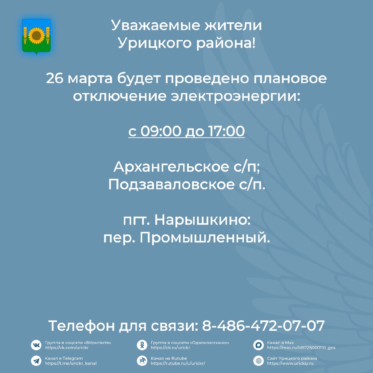 ! 📢 26 марта будет проведено плановое отключение электроэнергии в Урицком районе. Все подробности в карточке ⬆ #УрицкийРайон #АдминистрацияУрицкогорайонаОрловскойобласти