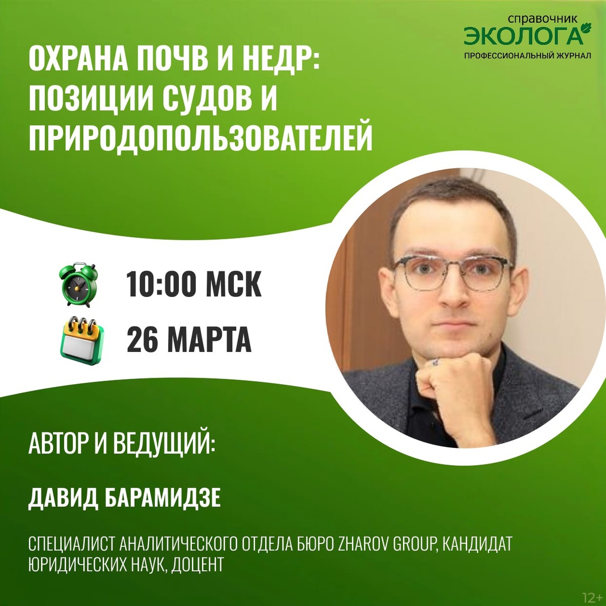 🔈 ВЕБИНАР Охрана почв и недр: позиции судов и природопользователей Автор и ведущий: Давид Барамидзе специалист аналитического отдела бюро Zharov Group, кандидат юридических наук, доцент Участие для подписчиков журнала «Справочник эколога» ❗️БЕСПЛАТНО❗️ Ориентировочная продолжительность вебинара —от 2 -х часов. После вебинара на электронную почту, которая была указана при регистрации, высылается запись вебинара, презентация и сертификат об участии. Подробнее читайте на сайте