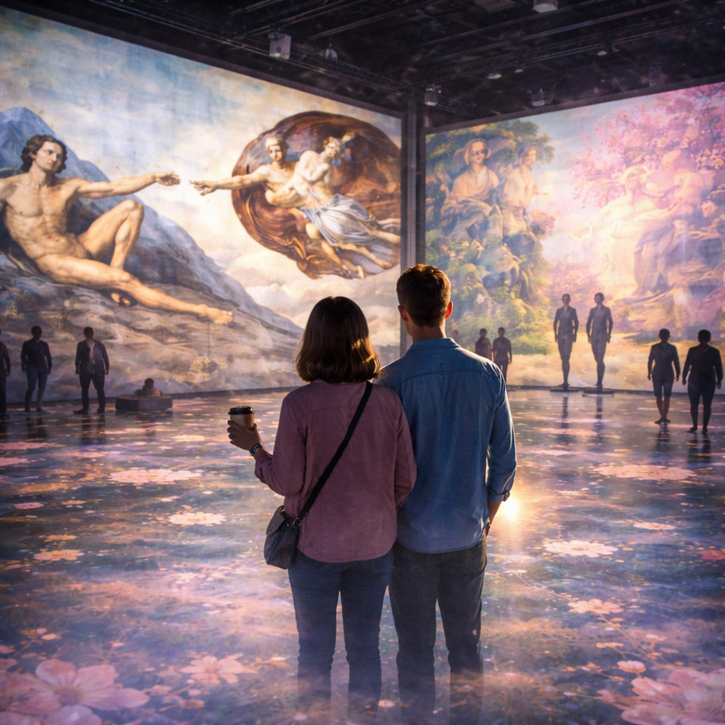 Привычные сценарии свиданий – кофе, ужин или кино – часто оставляют нас на поверхности: мы обсуждаем быт, работу или чужие сюжеты. Но поход в музей, особенно в мультимедийное пространство, – это «социальный лифт», который мгновенно перемещает отношения на уровень глубоких смыслов и общих переживаний. Почему искусство – лучший посредник между двумя людьми и как оно помогает узнать друг друга заново? Когда вы входите в темный зал, где оживают полотна Ван Гога или Босха, вы попадаете в общее эмоциональное поле. Музыка, масштаб проекций и отсутствие внешних раздражителей заставляют ваши сердца биться в одном ритме. Это редкий момент «здесь и сейчас», когда вы проживаете одну и ту же визуальную драму одновременно. Ваш спутник замирает перед хаосом «Герники» или его больше трогает тихий свет Айвазовского? Реакция на искусство говорит о человеке больше, чем анкета в соцсетях. Обсуждение увиденного– это поиск «точек соприкосновения» ваших ценностей. Искусство дает легальный повод поговорить о