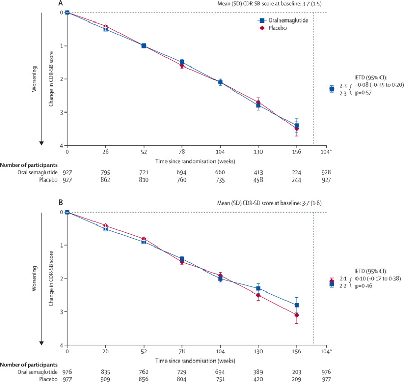 В работе, опубликованной в журнале The Lancet, не обнаружена польза от применения семаглутида (препарата из класса агонистов рецепторов GLP-1) для борьбы с развитием болезни Альцгеймера. Несмотря на многообещающие данные, выявившие, что у пациентов с диабетом 2-го типа прием агонистов GLP-1 связан с более низким риском развития деменции, прямое вмешательство с помощью семаглутида не привело к ожидаемому эффекту. Изменения показателя CDR-SB в группах приема семаглутида и плацебо. Оценивались как группа без сопутствующих поражений сосудов (график А), так и группа с сопутствующей сосудистой патологией малых сосудов головного мозга (график В). Credit: Jeffrey L Cummings et al. / The Lancet 2026 Семаглутид – это лекарственное средство из группы агонистов рецепторов глюкагоноподобного пептида-1 (GLP-1), которое применяется для снижения уровня сахара в крови при диабете 2 типа, а также при лечении ожирения. Кроме того, наблюдается снижение рисков тяжелых сердечно-сосудистых заболеваний. Наблю