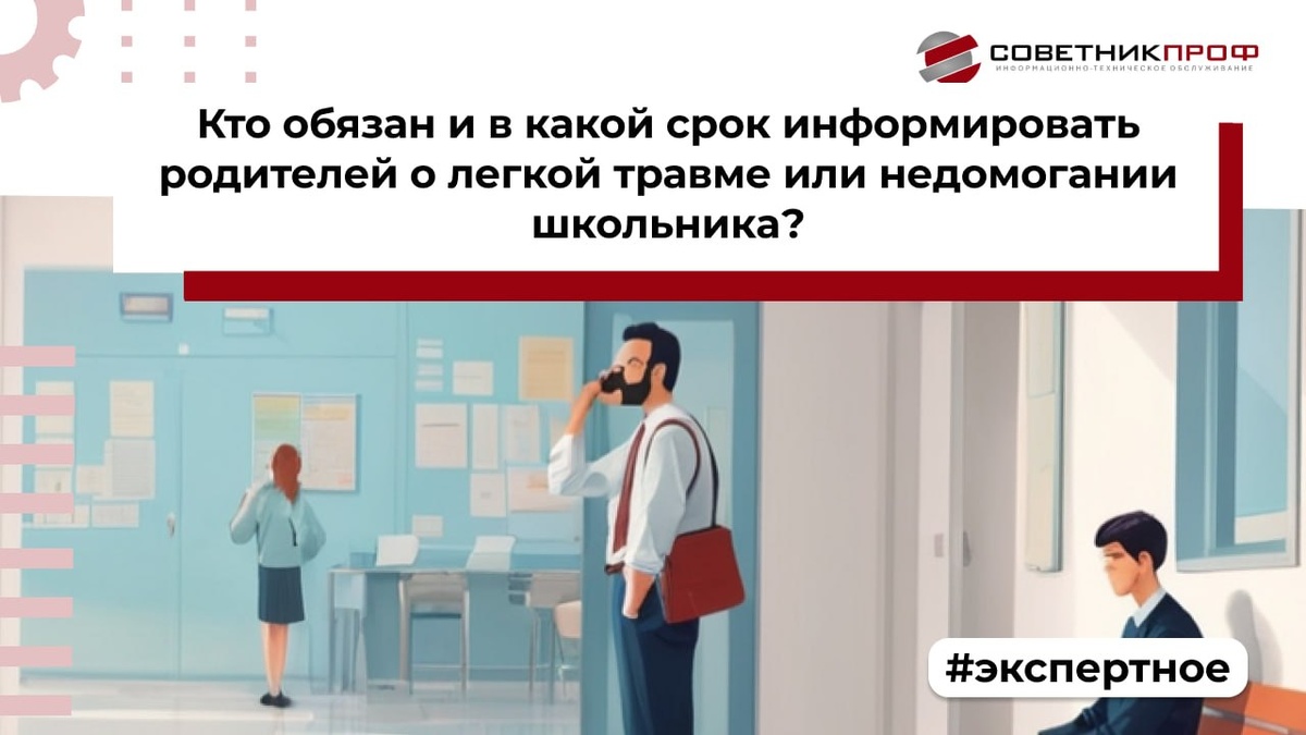ВОПРОС: Кто обязан и в какой срок информировать родителей о легкой травме или недомогании школьника? ОТВЕТ: Закон не устанавливает конкретный срок уведомления родителей о незначительных травмах или ухудшении самочувствия ученика, а также не определяет, кто именно должен это делать. 🏫 Образовательная организация вправе самостоятельно закрепить порядок уведомления в локальных актах. На практике информирование осуществляет тот сотрудник, кто может сделать это оперативнее – чаще всего классный руководитель или медсестра. ⚖️ Обоснование 🛡 Образовательная организация обязана обеспечивать безопасные условия обучения, включая охрану здоровья учащихся. Однако нормативные акты не содержат прямого указания, кто и в какие сроки должен уведомлять родителей о незначительных травмах или ухудшении самочувствия ребенка. 🔍 При этом действует Порядок расследования и учета несчастных случаев с обучающимися, утвержденный приказом Минобрнауки России от 27.06.2017 № 602. Согласно п. 5 Порядка, лицо,