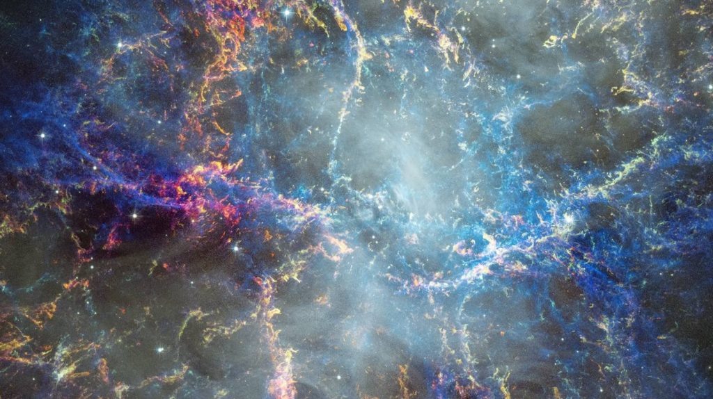 НАСА опубликовало новое изображение Крабовидной туманности. Телескоп «Хаббл» снова показал динамику одного из самых ярких объектов Галактики. Крабовидная туманность появилась после вспышки сверхновой, которую люди увидели в 1054 году. Китайские хроники писали, что этот объект сиял так ярко, что был заметен даже днём и держался на небе 23 дня. В центре туманности работает пульсар. Это нейтронная звезда с сильным магнитным полем. Она вращается 30 раз в секунду и выбрасывает поток частиц, который влияет на газ вокруг неё. Источник: NASA, ESA, W. Blair «Хаббл» получил первый снимок туманности в 1999 году. С тех пор НАСА много раз направляло телескоп к этому объекту, чтобы отслеживать изменения. Новые данные показывают скорость расширения — примерно 1500 км/с. Сравнение свежих снимков с архивом показывает важную деталь. Нити газа на краях ушли дальше от центра, чем структуры внутри. Они не вытянулись, а сместились наружу. Причина — пульсарный ветер. Поток частиц от пульсара ударяет в газ и