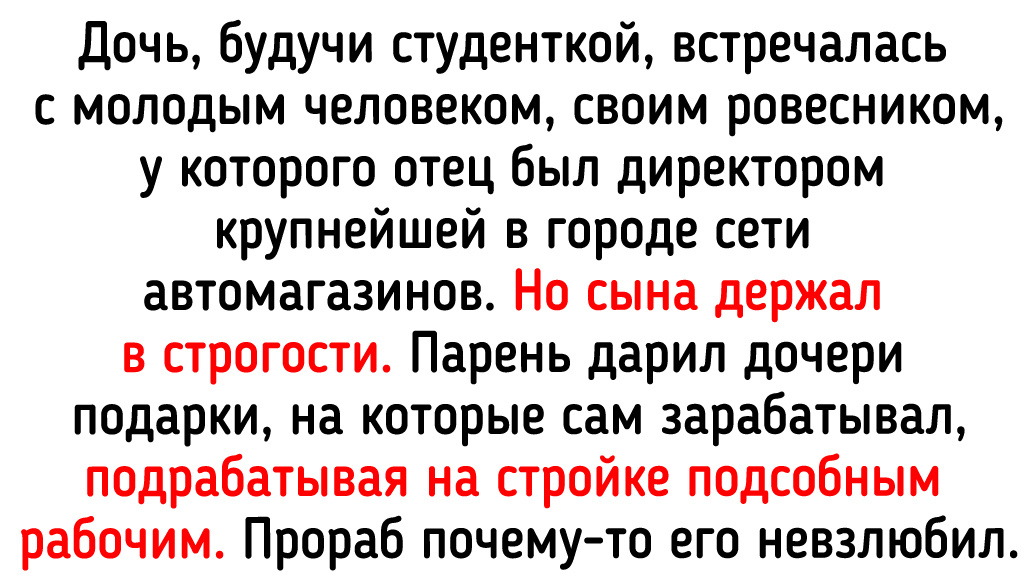 Дочь, будучи студенткой, встречалась с молодым человеком, своим ровесником, у которого отец был директором крупнейшей в городе сети автомагазинов. Но сына держал в строгости. Парень дарил дочери подарки, на которые сам зарабатывал, подрабатывая на стройке подсобным рабочим. Прораб почему-то его невзлюбил и всячески третировал, давал задания потяжелее, погрязнее. Одно время за молодым человеком на стройку стал заезжать отец — то на одной крутой машине, то на другой. Прораб спрашивает парня: «А кто это?» — «Отец». — «А он кто?» — «Директор того-то».