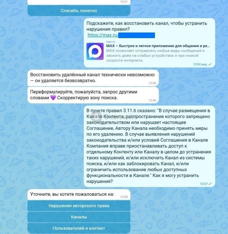 ? Снесен уже ряд ТГ-каналов, с большим количеством подписчиков, дублировавших контент в МАХ. Один из них принадлежал депутату "Справедливой России" Андрею Болгову, другие были каналами с эротическим контентом. Во всех случаях каналы были просто тупо заблокированы без возможности восстановления. Хотя по правилам МАХ, авторов должны были предупредить, что их действия нарушают политику мессенджера и направить требование об удалении контента.