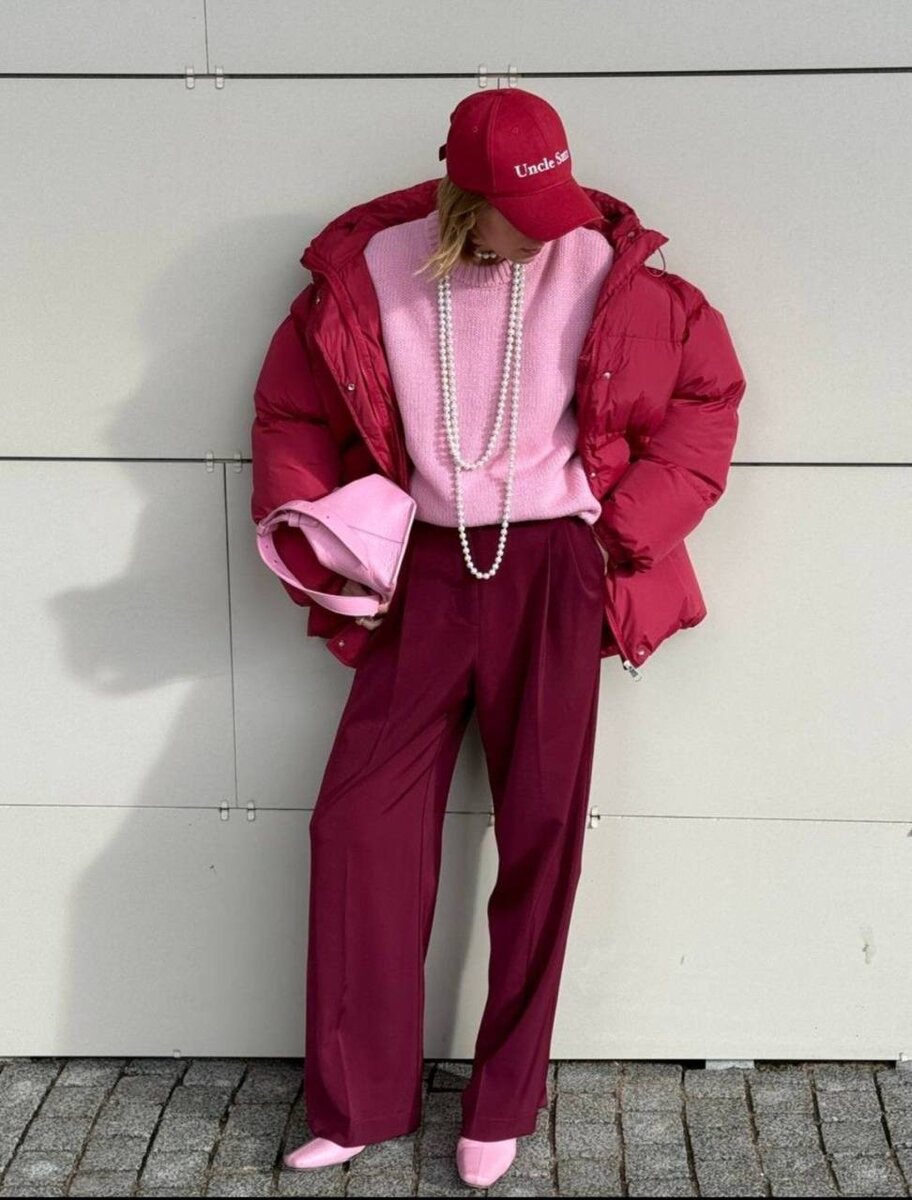 Этот образ — про смелость цвета и умение с ним работать. 🤍Здесь выстроена очень грамотная монохромная история: красный, бордовый и розовый — это одна цветовая семья, поэтому образ выглядит цельно и дорого. 🤍Отдельно важно, как работает баланс стилей. Пуховик и кепка дают спорт и расслабленность, а брюки с высокой посадкой, лодочки и длинное жемчужное ожерелье — это уже чистая элегантность. 🤍Жемчуг здесь — очень сильный стилистический ход. Он сразу поднимает уровень образа и делает его не просто повседневным, а продуманным. 🤍То же самое делает и сумка — аккуратная, в тон, она поддерживает всю композицию. Что важно отметить: — монохром в одной цветовой гамме всегда выглядит сложнее и дороже; — сочетание спорта и классики — один из ключевых приёмов современной стилистики; — аксессуары (особенно украшения) могут кардинально изменить настроение образа; — яркие цвета лучше «гасить» разной насыщенностью, а не добавлять новые оттенки. Ссылки на альтернативный образ тут👇 Куртка Джемп