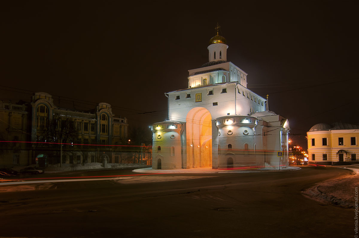 Неподалёку от ворот возвышается Успенский собор — один из важнейших памятников не только Владимира, но и всей страны. В XII–XIII веках он был главным кафедральным храмом Руси, именно здесь венчались на великое княжение владимирские и московские правители .