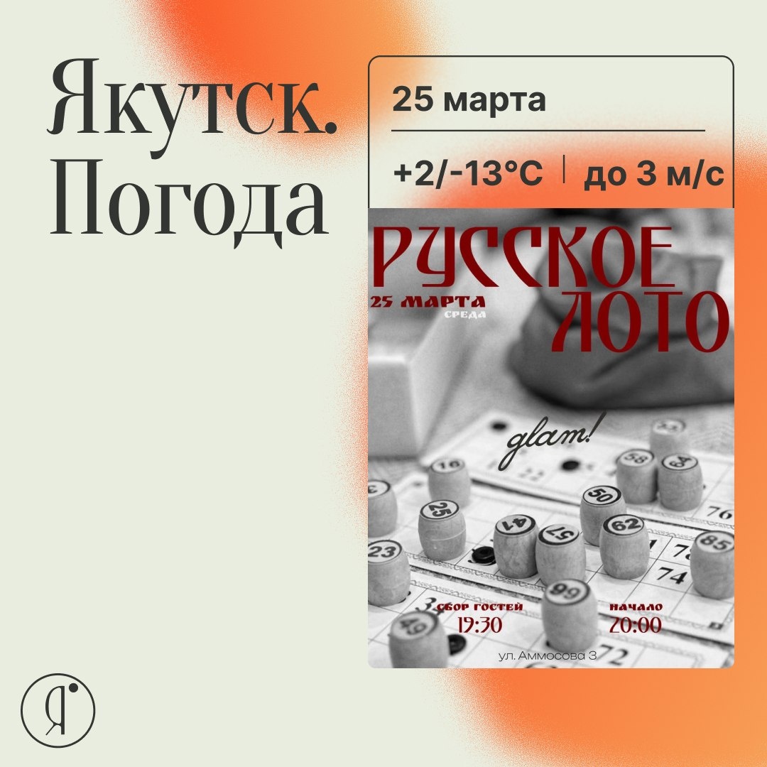 » Атмосфера весеннего веселья, призы, хорошая компания и немного азарта, что нужно этим мартовским вечером 🌸 💳 Сертификат на 3000 рублей в glam 🥛Самый вкусный Быырпах в Якутии от bwwppaq 🕵️♂️ Сертификат на проведение выездной игры от bala5an.mafia 🎩 Проходки на еженедельные игры от bala5an.mafia 📍 ул. Аммосова, 3, концепт-бар “glam!” 📅 среда, 25 марта 🕢 Сбор гостей в 19:30 🎮 Начало игры в 20:00 Регистрация: +79137334736 Online Якутия | Ждем вас в МАХ