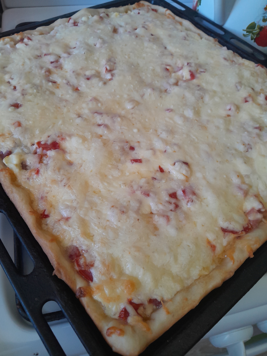Нарезаю на квадраты или треугольники. Эта пицца получается сытной, сочной и очень нарядной. Красные помидоры, белый слой яйца и румяная колбаса выглядят аппетитно. Идеально идет с простым кефиром или сладким чаем — это наше, родное.
