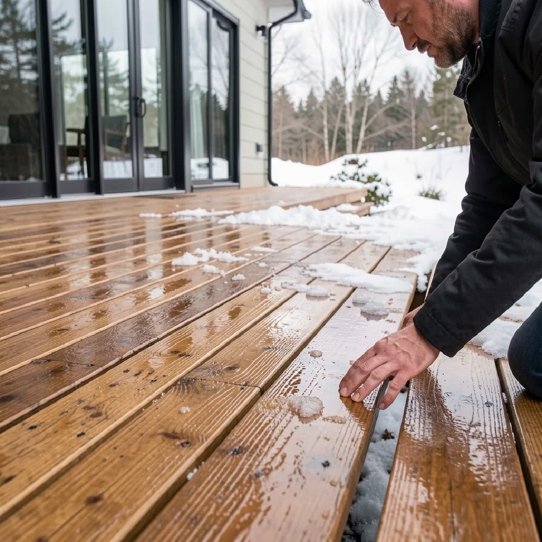 Многие совершают ошибку, пытаясь сразу после схода снега нанести свежее покрытие на фасад или террасу. Результат почти всегда неудачный: масло не впитывается, краска пузырится, а через месяц покрытие сходит хлопьями. Почему нельзя наносить защитные составы в марте: Но это не значит, что март нужно просто ждать. Это время активной подготовки. После зимы обязательно поднимитесь наверх и проведите тщательный осмотр: Свесы часто остаются без внимания, а проблемы начинаются именно там. Если заметили потемнение, шелушение защитного покрытия или трещины — отметьте эти места для весенней обработки. Обойдите дом по периметру и проверьте: Именно через проблемы в цокольной зоне влага чаще всего проникает в конструкции, запуская процессы гниения. Разные стороны дома требуют разного внимания: Южная и западная стороны