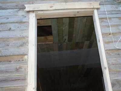 Теперь надо изготовить новые боковины. Высота проёма составляет 220 см. Из неё надо вычесть 5 см на усадку. Поэтому необходимо подготовить сосновый брус длиной 215 см, шириной 15 см, и высотой 10 см. Бруски таких размеров делают только на пилораме, поэтому надо заранее их заказать и высушить, так как окосячку рекомендуется строить из сухой древесины.