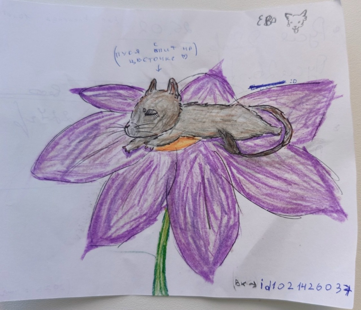 💜Рисунок участницы конкурса «Песчанка и весна» Евы (10 лет) "Пуся спит на цветочке