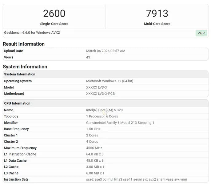 В первых тестах Intel Wildcat Lake младший мобильный Core 5 320 неожиданно показал очень сильный рост воднопоточном тесте, и для ультрабюджетного сегмента это уже выглядит как серьёзная заявка: • В базе Geekbench засветился мобильный Intel Core 5 320 из серии Wildcat Lake • В однопоточном тесте он набрал около 2600 баллов • Это почти уровень настольного Core i5-14600 и ряда заметно более дорогих мобильных чипов • В многопоточном тесте результат составил около 7900 баллов, то есть здесь без сюрпризной магии и уже заметно скромнее • Сам процессор использует конфигурацию 2P+0E+4LP, где упор сделан на два производительных ядра и четыре маломощных LP-ядра • По ранним данным чип может получить буст до 4,6 ГГц и встроенную графику с двумя Xe3-ядрами • Параллельно в CrossMark всплыл и младший Core 3 310, а в базе фигурирует платформа Dell, что намекает на подготовку первых ноутбуков • Пока это выглядит не как новый монстр по общему быстродействию, а как очень агрессивный заход Intel в бюджетны
