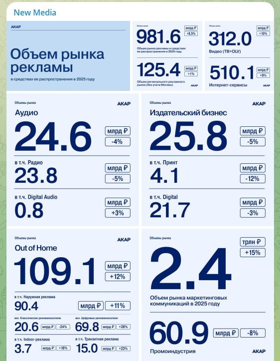 АКАР наАкаркал пост о грустных перспективах радиовещания, как рекламного носителя: Объём рекламного рынка РФ = 981.6 млрд (вырос на 8.5%), рекламный рынок Мск = 125.4 млрд (вырос на 1%) Он состоит из: интернет-сервисы = 510.1 млрд (вырос на 9%) видео (ТВ и видеореклама в интернете) = 312 млрд (вырос на 10%) наружная реклама + indoor = 109.1 млрд (вырос на 12%) издательский бизнес 25.8 млрд (упал на 5%) радио = 23.8 млрд (упал на 5%) digital audio = 0.8 млрд (вырос на 3%) и тд Основной причиной почти трехкратного снижения темпов роста российского рекламного рынка по сравнению с предыдущим годом стало резкое замедление общеэкономической динамики в стране - тревожно докладывает АКАР. Тут вроде радио не в топе, но ещё имеет долю рынка во всех смыслах, хоть и меньше 3% от общего объёма. И вроде стриминг (digital audio) тут так себе выглядит. Но только это ж про рекламную модель пишут. А вот в подписной модели другая история: По данным «Яндекс Музыки», в 2025 году российский рынок музык