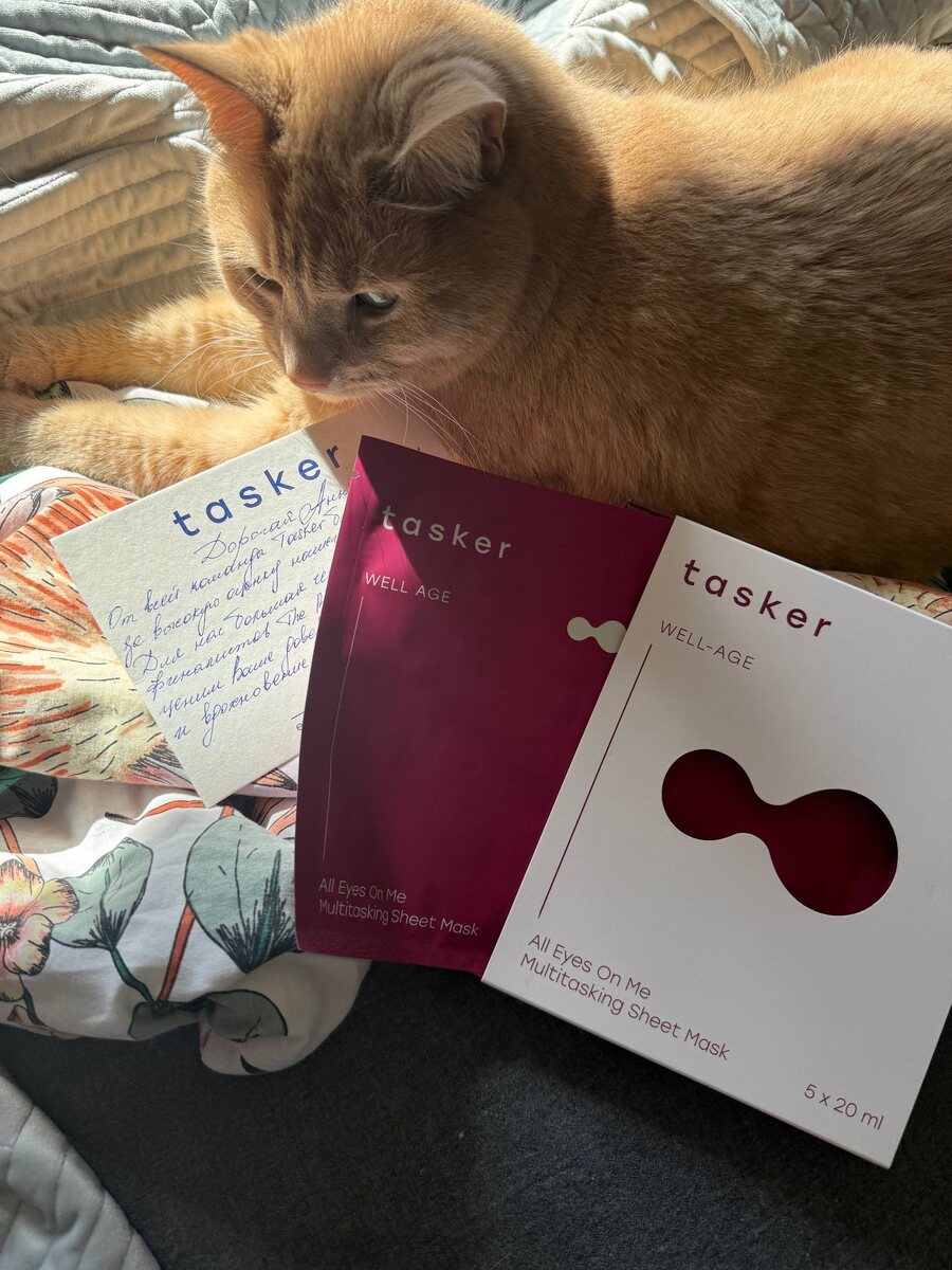 ? Для меня самое сложное — уложить саму себя в постель (у моего кота, как видите, таков проблема нет, он из постели и не вылезает). И это при том, что валяться я люблю, но по другим поводам. Сегодня я себя все-таки заставила лежать , хотя и с перерывами на почту, и тестирую маски нового российского бренда Tasker, вошедшего в этом году в список The Blueprint 100. Ее можно оставлять на 30 минут — самое то для дневного сна после чая с лимоном и медом вприкуску с витамином Д, омегой и цинком (следую рекомендациям Светланы Гребеньковой). Чтобы за пару дней снова стать свежим фруктом. В составе маски масла и постбиотики, чтобы усилить защитные функции кожи — в периоды болезни они всегда ослаблены и требуют заботы.