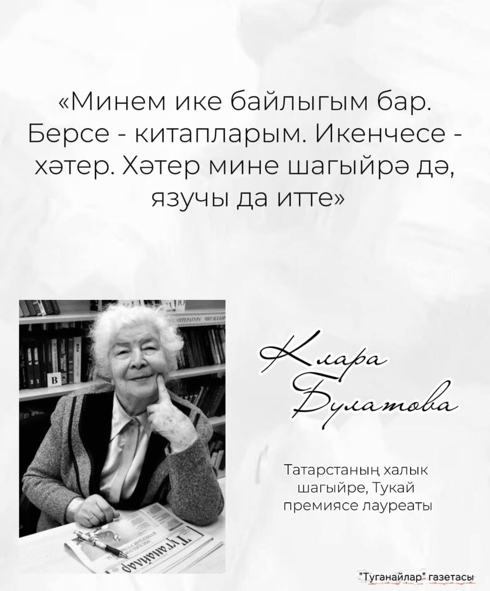 📖 Ул - Г. Тукай исемендәге Татарстан Дәүләт премиясе лауреаты, Татарстанның халык язучысы, дистәдән артык шигырь китаплары авторы. Клара Булатованың үсмерлек һәм яшьлек еллары Сарман районындагы Ләке авылында, керәшеннәр арасында үткән. Шуңа күрәдер дә, Клара Булатованың керәшеннәргә булган аерым бер ихтирамлы, эчкерсез яратулы мөнәсәбәте үзе иҗат иткән шигырьләрдә, хикәяләрдә дә урын алган. Аның 2011 елда басылып чыккан “Келәү” китабындагы барлык шигырьләре һәм повесте тулысынча керәшеннәргә багышланган❤️❤️❤️ @tuganaylar_2002