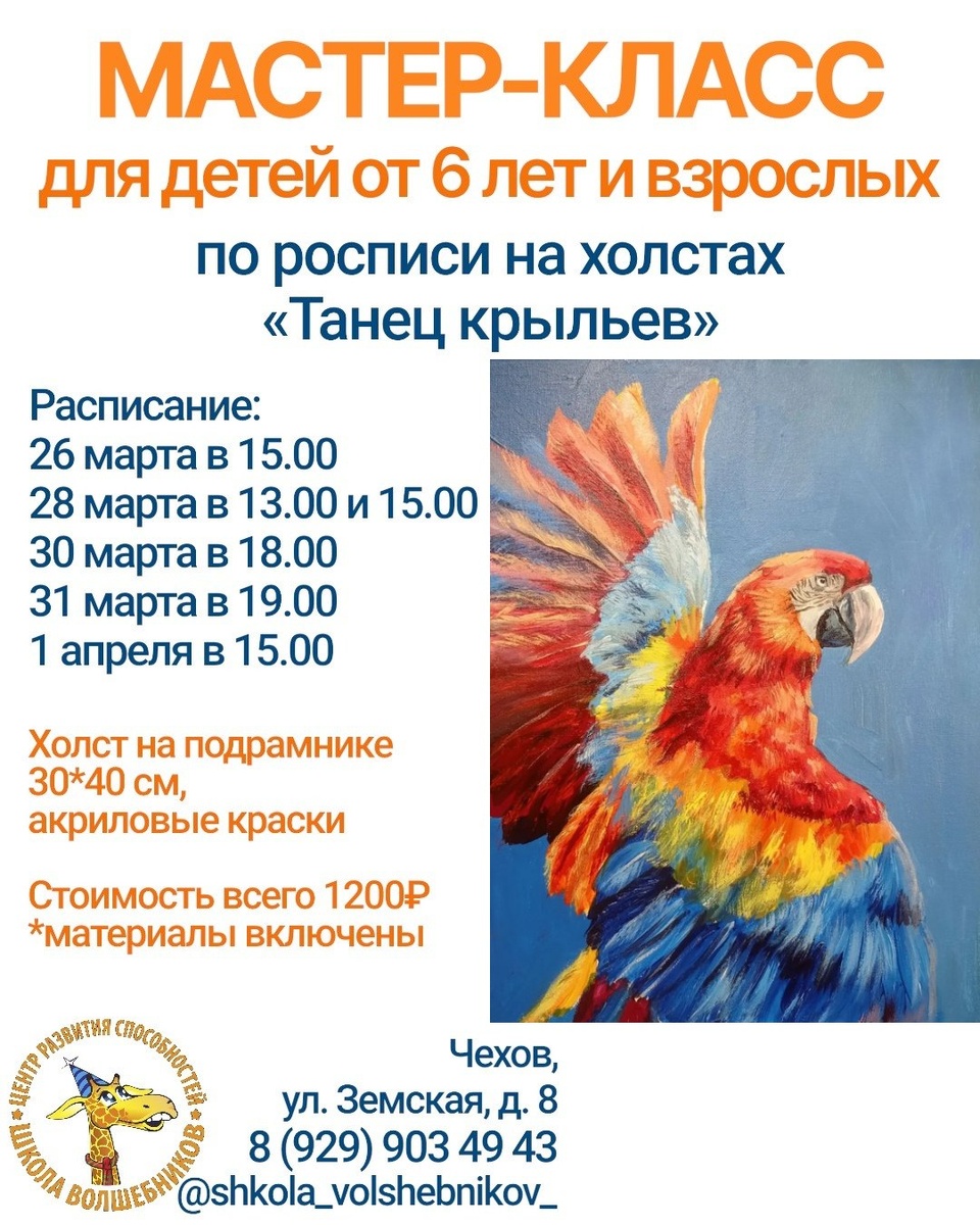 ✨ МАСТЕР-КЛАСС «Танец крыльев»🦜 Напишем очень красивый пейзаж с великолепным попугаем🦜на холсте акриловыми красками🎨Такую работу можно повесить дома и подарить своим любимым женщинам в качестве подарка🎁 А также проведем отлично время в приятной компании🙂 Ждём Вас! 📅26 марта 🕒15.00 28 марта 🕐13.00 и 15.00 30 марта 🕕18.00 31 марта 🕖19.00 1 апреля 🕒15.00 💻https://vk.com/volshebnikiclub 🚫 Возраст: 6+ 🏢 Центр Развития "ШКОЛА ВОЛШЕБНИКОВ" 📍 г.Чехов, микрорайон Губернский, ул.Земская, д.8 🔗 Записаться: https://t.me/+79299034943 ⭐Поддержать канал голосом #мастеркласс #картина #попугай #детскийцентр #школаволшебников #мастерклассдлядетей ✅ Мероприятия Чехов https://dzen.ru/id/66cc4b48e9ef144699238a51 https://vk.ru/chekhov_events http://dzen.ru/chekhov_events