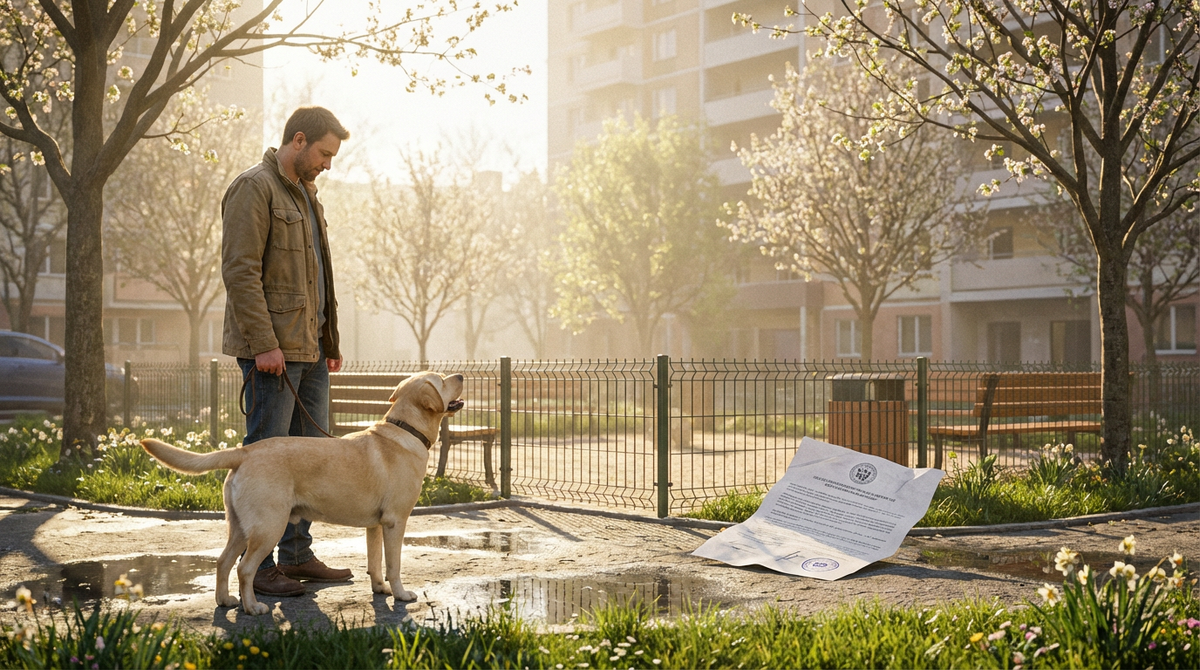 Вот знакомая картина: утро, двор, человек с кофе в одной руке и поводком в другой. Пёс тянет к ближайшему газону, хозяин смотрит на предмет дворника и соседей. Минута дела, пакетик в кармане (или не в кармане, будем честны), и оба уйдут. Никакой площадки, никаких ограждений, никаких правил. Привычно. Удобно. А с апреля 2026-го — всё менее законно.