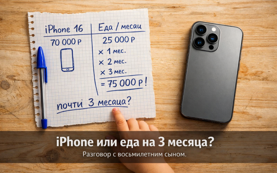 Сын подошёл ко мне в воскресенье вечером с очень серьёзным видом. Сел рядом, помолчал немного - и сказал: «Пап, у всех в классе уже есть iPhone. Мне одному не купили». Ему восемь лет. Он уже освоил технику давления через социальное сравнение. Я почти загордился - и одновременно понял, что нужен нормальный разговор, а не просто «нет». Но потом решил не просто сказать «нет». Решил объяснить. Взял листок в клетку, ручку и нарисовал две колонки. Слева - iPhone 16 базовый, самый доступный в линейке сейчас: 69 000-72 000 рублей в 2025 году в зависимости от магазина. Справа - наш семейный продуктовый бюджет на месяц: около 25 000-28 000 рублей на троих. Хлеб, мясо, молоко, фрукты, всё необходимое. Потом попросил его посчитать самому. Сколько месяцев еды стоит один телефон? Он считал долго, по пальцам. Потом поднял глаза: «Почти три месяца?» «Почти три месяца», - подтвердил я. Он замолчал. Это была правильная пауза - не обиды, а думанья. Слово «дорого» для ребёнка - пустое. Он не понимает, ч