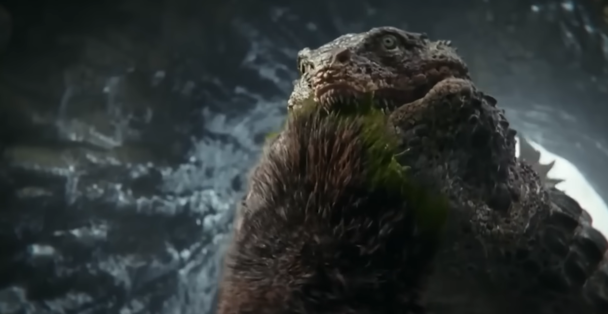 Малыш Даг вырастает до 43 м в высоту и до 94 м в длину. Это как многоэтажный дом. Просто представь, что такая собачка перекрывает целую автомагистраль. И при всём этом он почти мелочь. Рядом с Конгом, который переваливает за 100 м, он выглядит как французский бульдог: короткий, мощный и с характером. Впервые мы его увидели в «Годзилле против Конга» в той самой сцене, где он хватает гигантского краба и уносится прочь. Потом он появляется и в «Новой империи», и там окончательно очевидно, что его стиль — не охота, а воровство. Он не дерётся с альфа-титанами, он просто ждёт момент, хватает чужую добычу и исчезает. Его специально сделали похожим на Годзиллу, только без пафоса и атомных пластин. Как будто это дальний родственник короля монстров, который забил на спортзал и решил жить попроще.