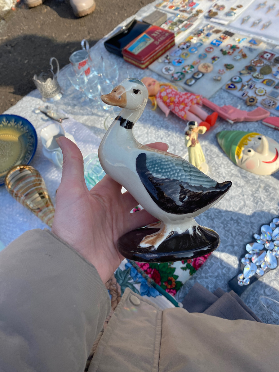 Например, эта утка. Отлично подобраны цвета в росписи. Продавец презентовал мне ее как итальянскую. А Гугл эту информацию не подтвердил. Вроде бы румынский фаянс, но не возьмусь биться за истину.