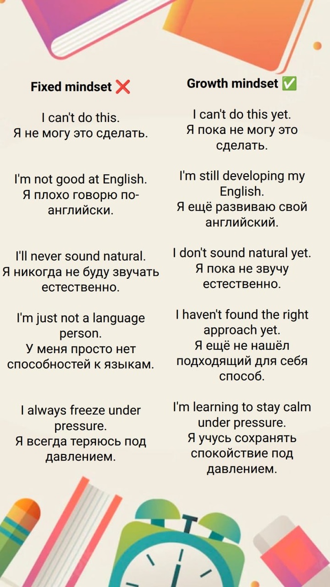Я ей поверила. И жила с этим очень долго. Пока однажды не пошла в школу правополушарного рисования. За один день меня научили. Не как Моне - но такой задачи у меня не было. Мне нравился и процесс, и результат. А главное – у меня появилось новое ощущение себя, которое мне тоже очень нравилось. Дело часто не в способностях. Дело в подходе и установке, которую кто-то вложил. А мы принимаем ее и носим с собой как факт. Психолог Кэрол Двек называет это fixed mindset - убеждение, что способности даны от природы и изменить их нельзя. «Я не музыкальный». «У меня нет способностей к языкам». «Я технарь, не гуманитарий». Звучит знакомо? Эти фразы кажутся описанием реальности - но на самом деле это выученные ограничения. Часто созданные кем-то другим. Противоположность - growth mindset. И там есть одно маленькое слово, которое меняет всё. Не «я не умею говорить по-английски бегло в стрессовой ситуации», а «я ещё не умею говорить по-английски бегло в стрессовой ситуации». Ещё. Одно слово. Но оно пе