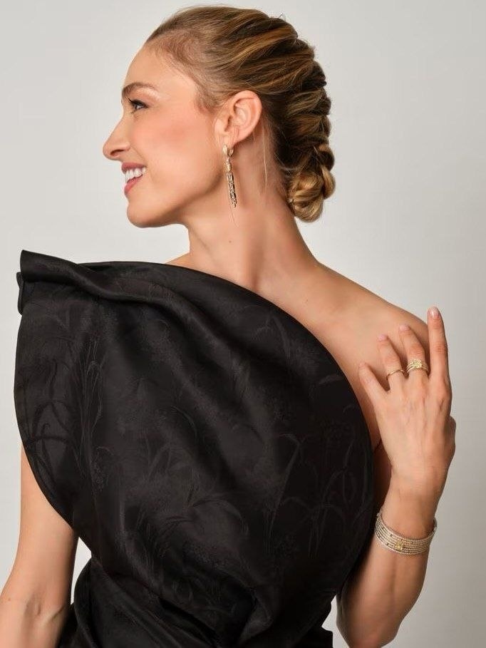 Платье Dior, а украшения от испанского бренда Suárez – кольцо, браслет и серьги из белого и желтого золота с белыми и желтыми бриллиантами