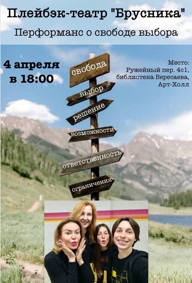 #Москва Профессиональный плейбэк-театр «Брусника» в перформансе о свободе выбора Начало в 18:00 Когда слышишь "апрель" - почти всегда одной из ассоциаций всплывает "свобода". Вот и мы - театр Брусника - о ней подумали, поэтому предлагаем вам поделиться историями и впечатлениями о свободе в вашей жизни - а мы сыграем. Особенно нам интересна тема свободы выбора: она вообще есть, ее не хватает, совсем нет? 🔸На что бы вы потратили неограниченную свободу выбора? 🔸А бывало так, что выбор слишком огромен, поэтому выбрать невозможно? 🔸Или вы отвоевываете свою свободу? 🔸А может, вас тяготит принятие решений и ответственность за них, и вы передаете другим свою свободу выбора? В общем, приходите на перформанс, расскажите нам, как вы обращаетесь с имеющейся свободой выбора, и мы это оживим на сцене. Адрес: Москва, Ружейный переулок 4стр1 Арт-Холл библиотеки Вересаева Билеты: 1000 рублей Регистрация по ссылке Информация и бронирование: +79857290043 Анна #Брусника #Перформанс #Россия