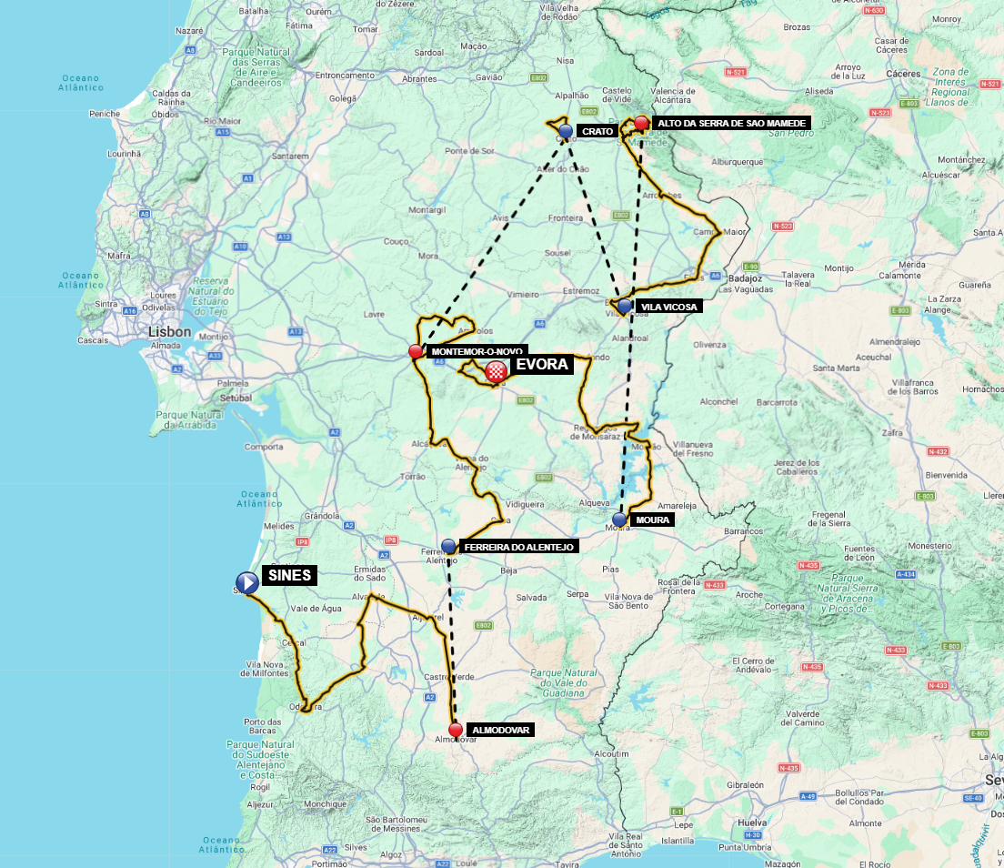 В 2026 году организаторы подготовили для участников сбалансированный, но жесткий маршрут из пяти этапов общей протяженностью 673.8 километра. Гонщиков ждет классический португальский коктейль: прибрежные ветра, холмистые долины Алентежу, решающая индивидуальная гонка и кульминационный горный финиш, который, по традиции, определит победителя генеральной классификации.