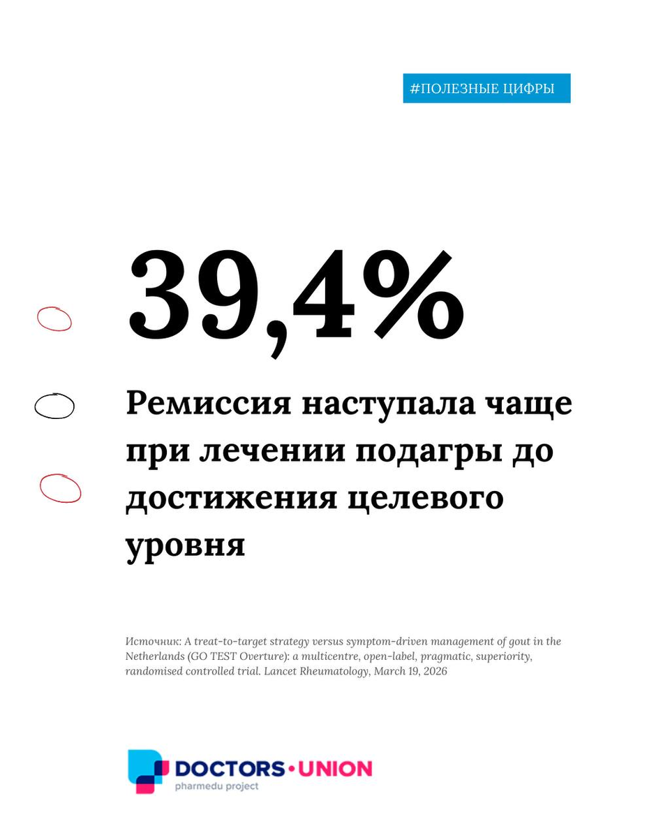 Источник: A treat-to-target strategy versus symptom-driven management of gout in the Netherlands (GO TEST Overture): a multicentre, open-label, pragmatic, superiority, randomised controlled trial. Lancet Rheumatology March 19, 2026