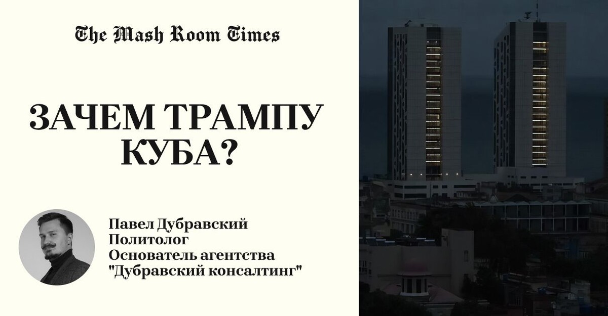 Все смотрят на Иран, но никто не замечает следующей цели Трампа — Кубу. Остров находится в блокаде. И американский президент может положить конец революции Кастро и Че Гевары и либо поменять власть на острове свободы. Либо вообще присоединить его к США. Вы не поверите, но подробно об этом уже можно прочитать в новой еженедельной авторской колонке Павла Дубравского — политолога и основателя "Дубравский консалтинг" — специально для The Mash Room Times: