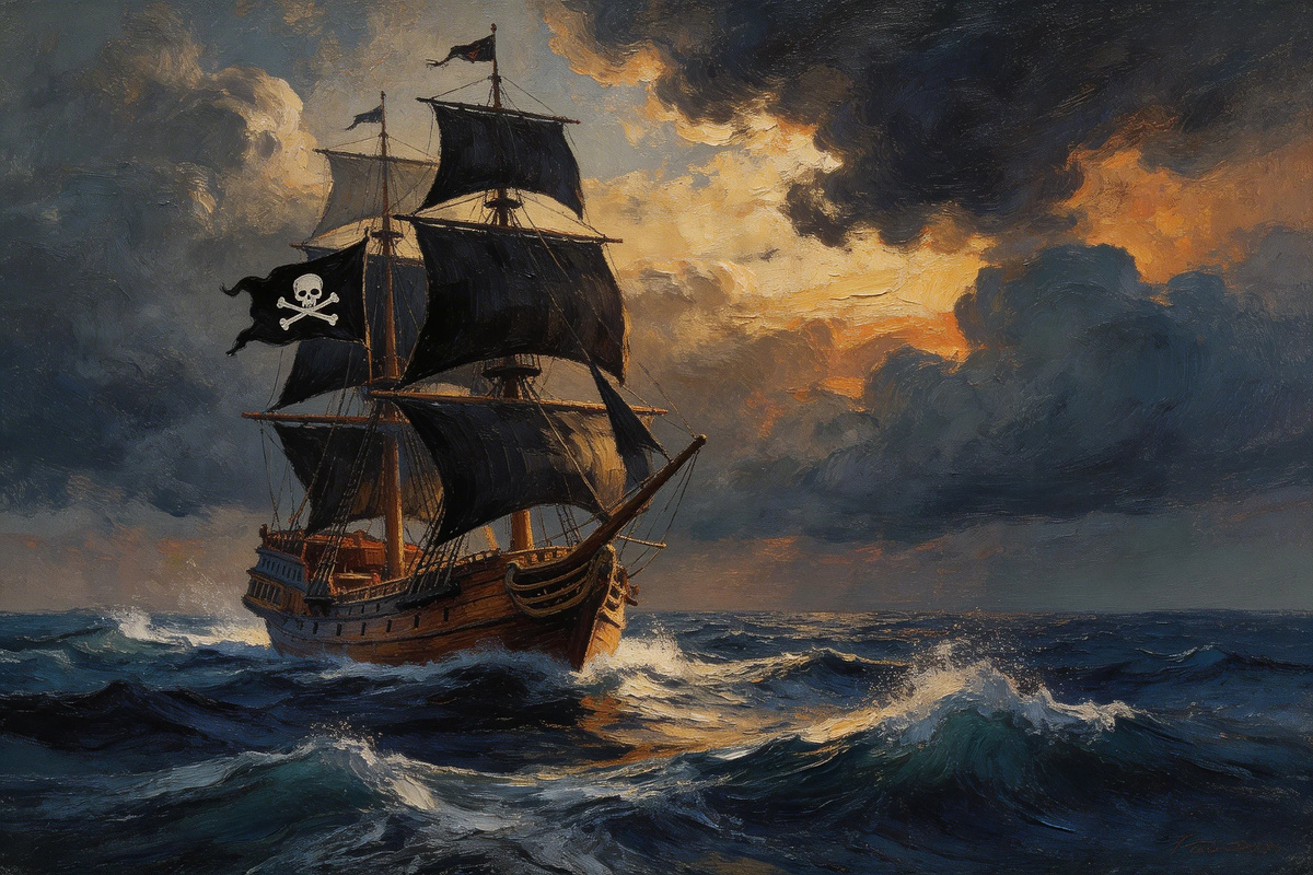 Черный флаг с белым черепом и скрещенными костями — символ, который тут же вызывает ассоциации с морским разбоем, нескончаемыми приключениями и ромом, льющимся рекой. Этот зловещий стяг наводил ужас на торговые суда XVII–XVIII веков. Завидев его на горизонте, капитаны понимали: впереди ожесточенный бой или безоговорочная капитуляция. Но откуда взялось столь странное, почти насмешливое название — "Веселый Роджер"? Почему грозный символ пиратства носит имя, которое звучит скорее как кличка пухлого весельчака из портовой таверны? История этого названия окутана легендами и гипотезами, каждая из которых по-своему объясняет происхождение знаменитого флага. Самая распространенная версия связана с французским выражением "joli rouge", которое обычно переводят как "ярко-красный" или "кроваво-красный". В эпоху расцвета пиратства морские разбойники использовали два флага: черный и красный. Если был поднят черный флаг, то экипаж торгового судна, сдаваясь без боя и отдавая содержимое трюма на разгра