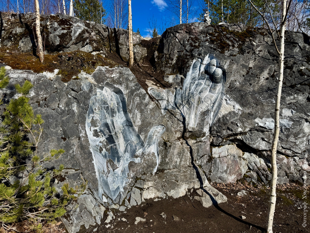 Одна из моих самых любимых локаций — Белая гора (или «Сад камней»). Здесь мрамор не просто фон, а настоящий скульптурный материал: огромные глыбы, высеченные в камне фигуры, неприметные на первый взгляд рельефы.