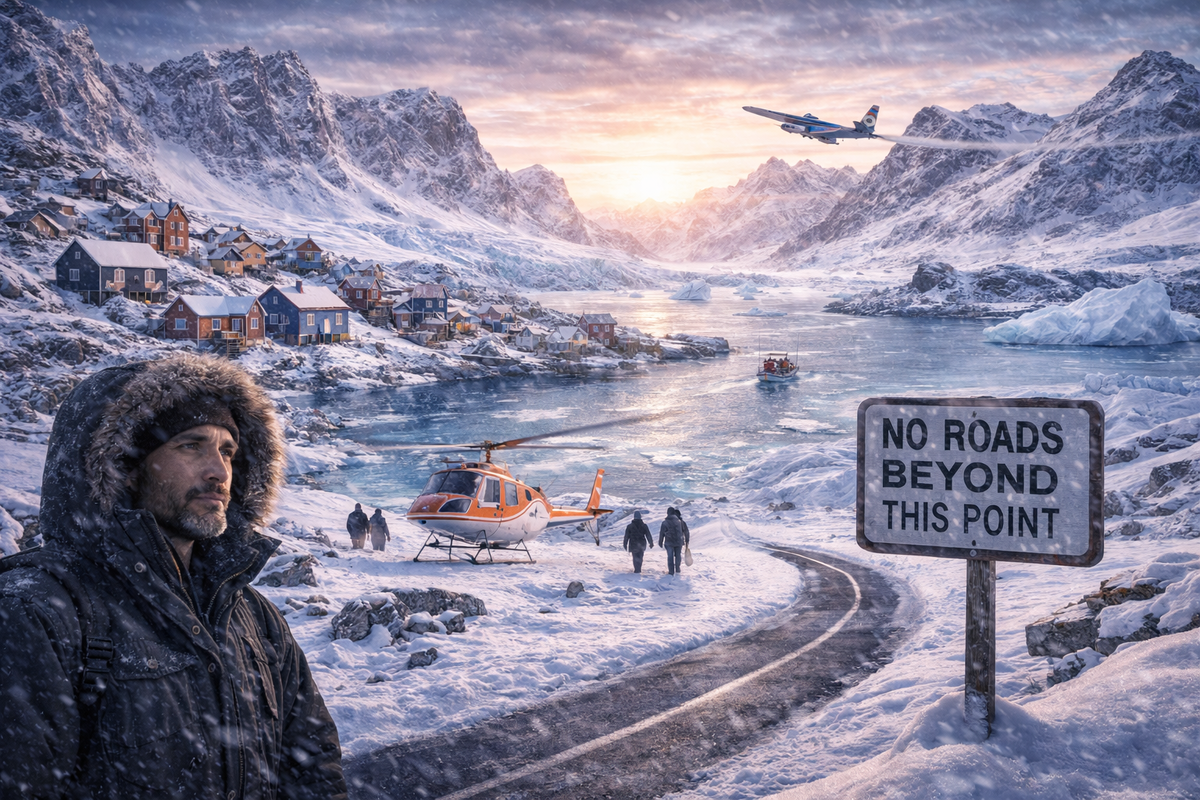 В Гренландии можно жить в городе, который находится всего в 150 километрах от другого — и при этом никогда туда не доехать на машине. Не потому что далеко. А потому что дороги между ними просто не существует. И это не недоработка и не временная проблема. Это нормальное устройство страны, где сама природа делает дороги почти бессмысленными. Лёд здесь заменяет землю Если посмотреть на карту, кажется, что всё должно быть проще. Расстояния не такие уж большие, населённые пункты есть, логично было бы соединить их трассами. Но в реальности между ними лежит совсем не «пустое пространство». Большую часть острова покрывает ледяной щит толщиной в километры. Это не неподвижная поверхность, а медленно движущаяся масса льда. Она трескается, смещается и постоянно меняется. Любая дорога на таком основании просто не будет надёжной. А там, где льда нет, ситуация не становится легче. Побережье изрезано горами, скалами и фьордами, которые буквально разрывают территорию на отдельные куски. Города здесь не