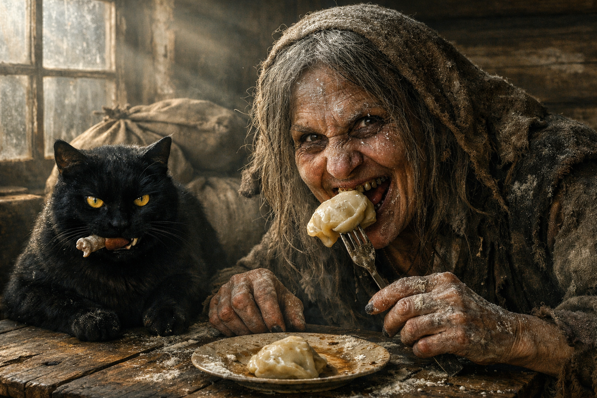 Тишина в хижине у оврага была густой и липкой — такой, какая рождается только в старых заброшенных деревнях. Дима, молодой блогер, который еще несколько секунд назад снимал «магию русской глубинки», замер с фонариком в руке. В дверном проеме стояла Марта. В мерцающем свете светодиодов ее лицо, обсыпанное белой мукой, напоминало гипсовую посмертную маску. — Чего в темноте сидите, голубчики? — проскрипела она; голос ее напоминал звук сухой земли, падающей на крышку гроба. — Я вам гостинец принесла. Пельмешки... с пылу с жару. Начинка — чистый сок, сама собирала. Дима попятился; его девушка, Алиса, забилась в угол дивана.