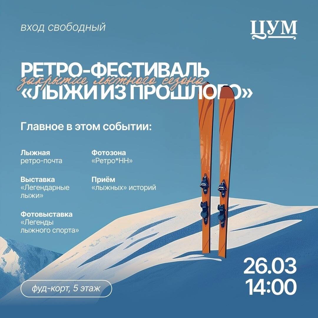 ✨ Ретро-фестиваль «Лыжи из прошлого» в ЦУМе 26 марта в 14:00 📍 5 этаж (фуд-корт) 🎫 Вход свободный Это не просто выставка — это ностальгия + история спорта в одном месте. Тут можно буквально прикоснуться к эпохе, когда лыжи были не трендом, а легендой. Что будет: — редкие и культовые модели лыж — большая фотовыставка — фотозона с экипировкой чемпионов — встреча с ветеранами спорта — живая экскурсия с историями и лайфхаками — ретро-почта с бесплатными открытками И да, если у вас где-то лежат старые лыжи — можно принести и дать им вторую жизнь 📌 Фотовыставка будет работать до 14 мая 👉 Подписаться на нас в MAX 📲 .